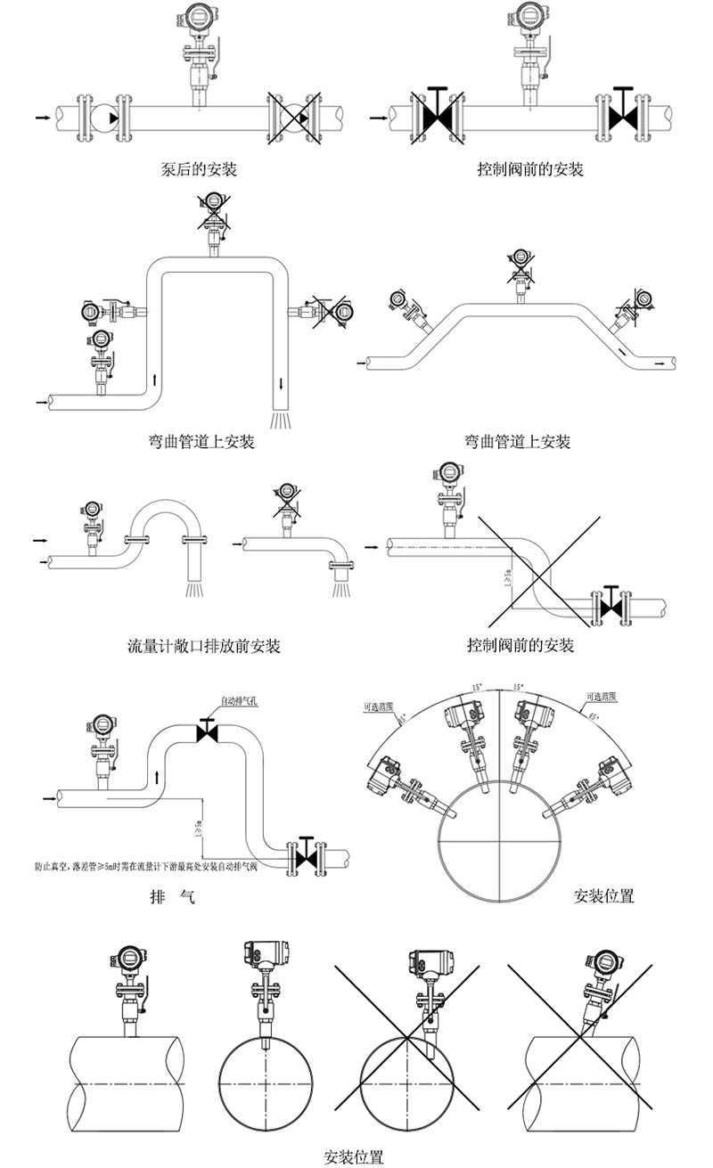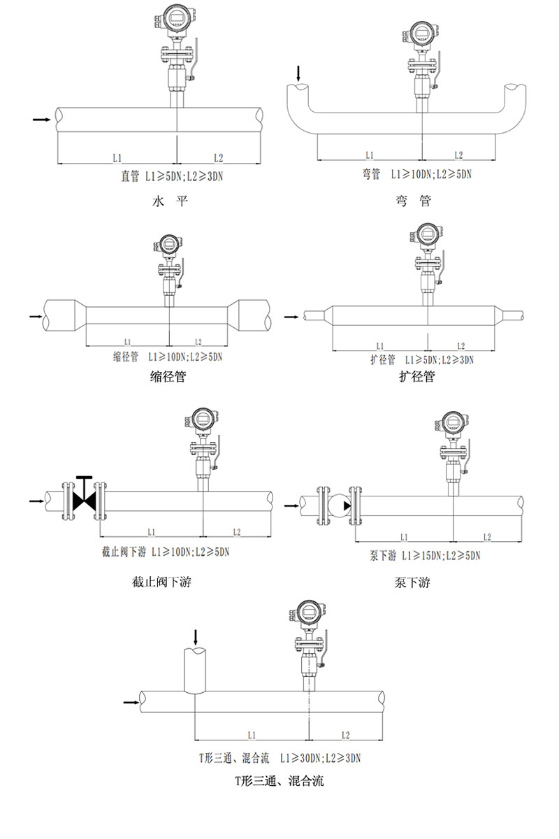 2.安裝條件 2.1直管段 使用直管段可防止介質因彎管、TT型三通、截止閥、變徑管的影響而產生渦流或失真