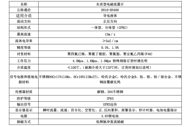 ●儀表結構簡單、可靠,無可懂部件,工作壽命長 ●無截流阻流部件,不存在壓力損失和流體堵塞現象 ●無機械慣性,響應快速,穩定性好,可應用于自動檢測、調節程控系統 ●測量精度不受被測介質的種類及其溫度、粘度、壓力等物理量參數的影響,精度高 ●采用聚四氟乙烯或橡膠材質襯里和HC、HB、316L、鈦等電極材料的不同組合可使用不同介質的需要 ●無線傳輸,GPRS遠程在線設置和短信息遠傳設計功能 ●3.6V電池供電,低功耗