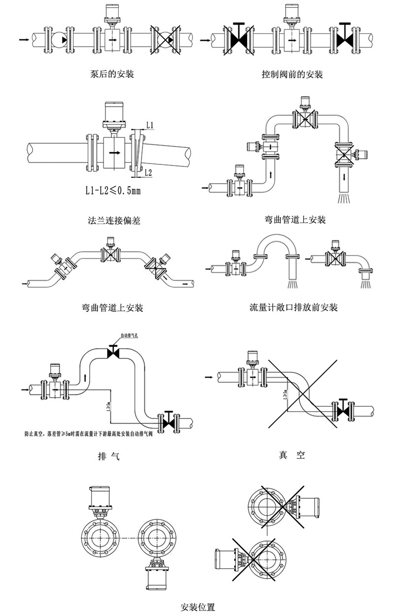 1. 通用要求 a、為了安裝、維護、保養方便,在流量計周圍需保留足夠的空間 b、避免流量計安裝在溫度變化很大或受到設備高溫輻射的場所 c、流量計應安裝在室內,如安裝在室外,應避免陽光直射,必要時請安裝防曬裝置 d、避免流量計安裝在含有腐蝕性氣體的環境中 e、避免流量計安裝在有強振動源、強磁場的場所 2. 工藝管要求 a、 上、下游工藝管的內徑與流量計的內徑應滿足:0.98DN≤D≤1.05DN(DN:流量計內徑;D:工藝管內徑) b、工藝管與流量計需同心,同軸偏差不大于0.05DN