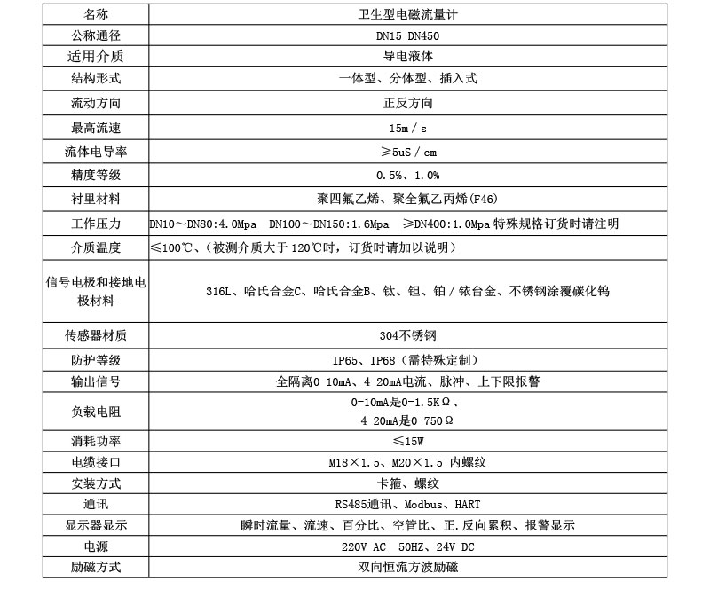 衛(wèi)生型電磁流量計采用了新型的衛(wèi)生型襯里材料和襯里工藝,符合食品行業(yè)的衛(wèi)生要求,同時采用了不銹鋼外殼及不銹鋼卡箍連接,方便電磁流量計的快速拆卸、清洗,使電磁流量計在使用過程中不易被污染,且能有效防止測量流體殘余物在測量管中的堆積,可廣泛應用于礦泉水、醬油、果醬、啤酒、果汁、米酒、牛奶等食品的生產制造過程及衛(wèi)生、化工等領域。