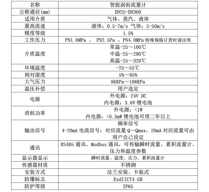 智能渦街流量計,主要用于工業管道介質流體的流量測量,如氣體、液體、蒸 汽等多種介質。其特點是壓力損失小,量程范圍大,精度高,在測量工況體積流量時 幾乎不受流體密度、壓力、溫度、粘度等參數的影響。無可動機械零件,因此可靠性 高、維護量小。儀表參數能長期穩定。本儀表采用壓電應力式傳感器,可靠性高,可在-25℃~+320℃的工作溫度范圍內工作。有模擬標準信號,也有數字脈沖信號輸出,容易 與計算機等數字系統配套使用,是一種比較先進、理想的流量儀表。