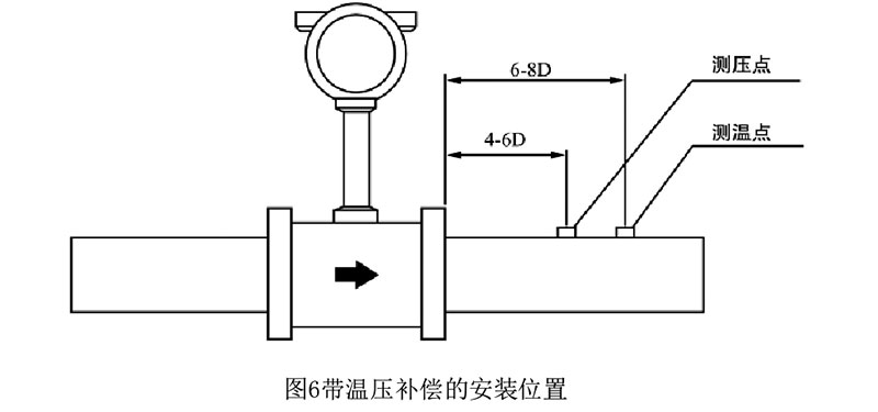 電氣安裝應注意傳感器與轉換器之前采用屏蔽電纜或低噪聲電纜連接,其距離不應 超過使用說明書的規定。布線時應遠離強功率電源線,盡量用單獨金屬套管保護。應遵 “一點接地”原則,接地電阻應小于10Ω。整體型和分離型都應在傳感器側接地,轉 換器外殼接地點應與傳感器“同地”。帶溫壓補償時安裝位置,如圖6所示。