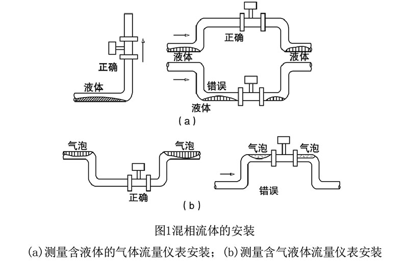 安裝注意事項 渦街流量計屬于對管道流速分布畸變、旋轉流和流動脈動等敏感的流量計,因此, 對現場管道安裝條件應充分重視,遵照生產廠使用說明書的要求執行。渦街流量計可安裝在室內或室外。如果安裝在地下井里,有水淹的可能,要選用潛 水型傳感器。傳感器在管道上可以水平、垂直或傾斜安裝,但測量液體和氣體時為防止 氣泡和液滴的干擾,安裝位置要注意,如圖1所示。