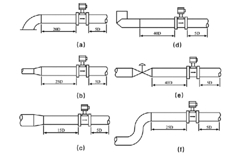 渦街流量計必須保證上、下游直管段有必要的長度,如圖所示。在各種資料中數 據有差異,其原因可能是,旋渦發生體尚未標準化,形狀尺寸的差異有多少影響尚待驗 證;對各類阻流件必要的直管段長度試驗研究尚不夠,即還不成熟,對比節流式差壓流 量計,這方面工作還處于初始階段。