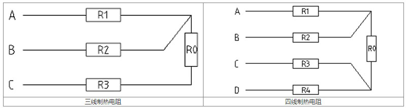 如上圖所示,不管四根引線的電阻R1、R2、R3、R4是否相等,測溫元件電阻R0都與引線電阻的大小無關,并可表達為:R0=(RAD+RBC-RAB-RCD)/2。