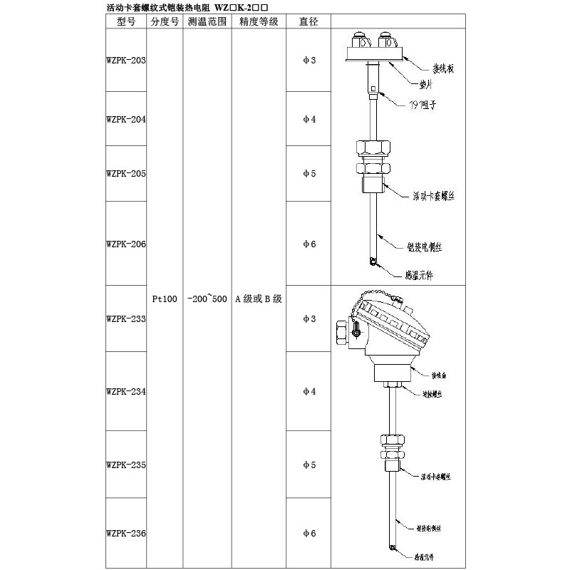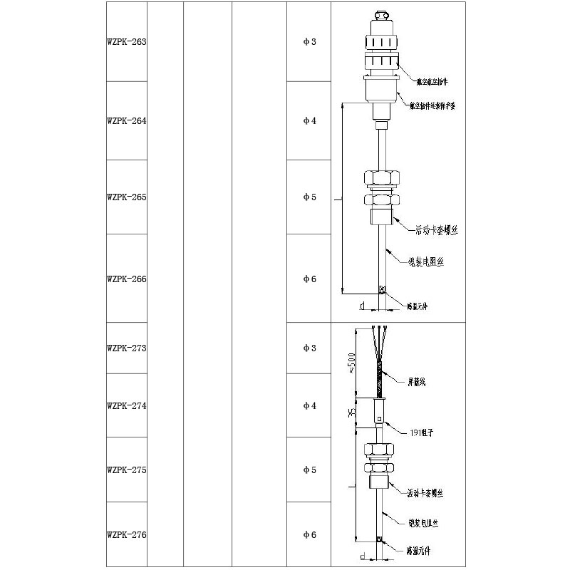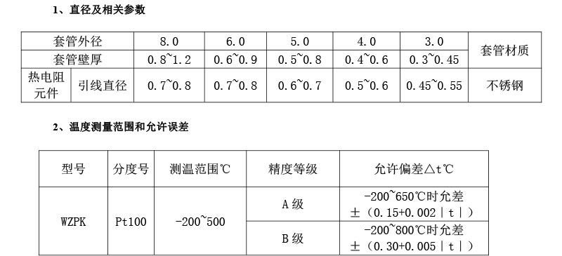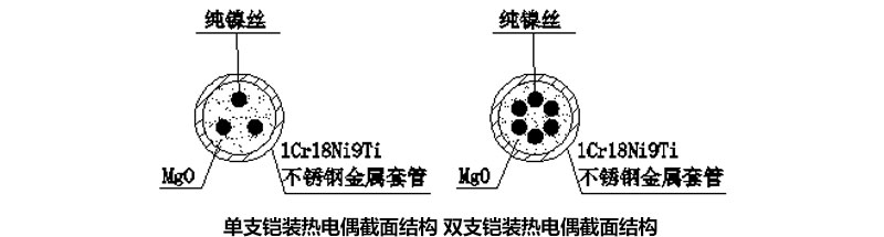 鎧裝熱電阻的結構,除五部中的測溫元件、絕緣材料、保護套管三部分構成鎧材整體以外,其余與常規熱電阻的結構相同。鎧材(測溫元件、絕緣材料 、保護套管):測溫元件對熱電阻來說是感溫元件及其內引線;各熱電阻引線之間,及其與保護套管之間用氧化接作絕緣材料;用金屬管保護絕緣材料和測溫元件。鎧材工藝使測溫元件、絕緣材料、保護套管三者成為一個不可拆卸的可撓的緊密實體,鎧材是制造鎧裝熱電阻的基體材料, 鎧材不能直接用于測溫,必須制作測量端和簡易接線端后方可作為基型鎧裝熱電阻使用。