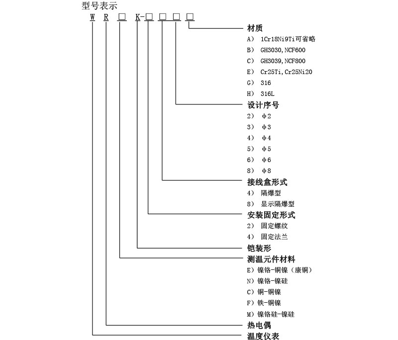 隔爆熱電偶與裝配式熱電偶的結(jié)構(gòu)、原理基本相同,所區(qū)別的是,隔爆型產(chǎn)品接線盒(外殼)在設(shè)計上采用防爆特殊結(jié)構(gòu),接線盒用高強度鋁合金壓鑄而成,井具有足夠的內(nèi)部空間、壁厚和機械強度,橡膠密封圈的熱穩(wěn)定性均符合國家防爆標準。所以,當接線盒內(nèi)部的爆炸性混合氣體發(fā)生爆炸時,其內(nèi)壓不會破壞接線盒,而由此產(chǎn)生的熱能不能向外擴散、傳爆。